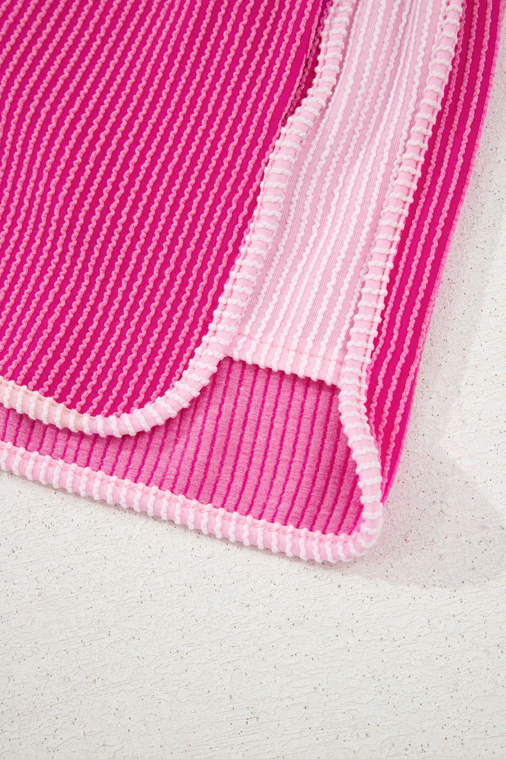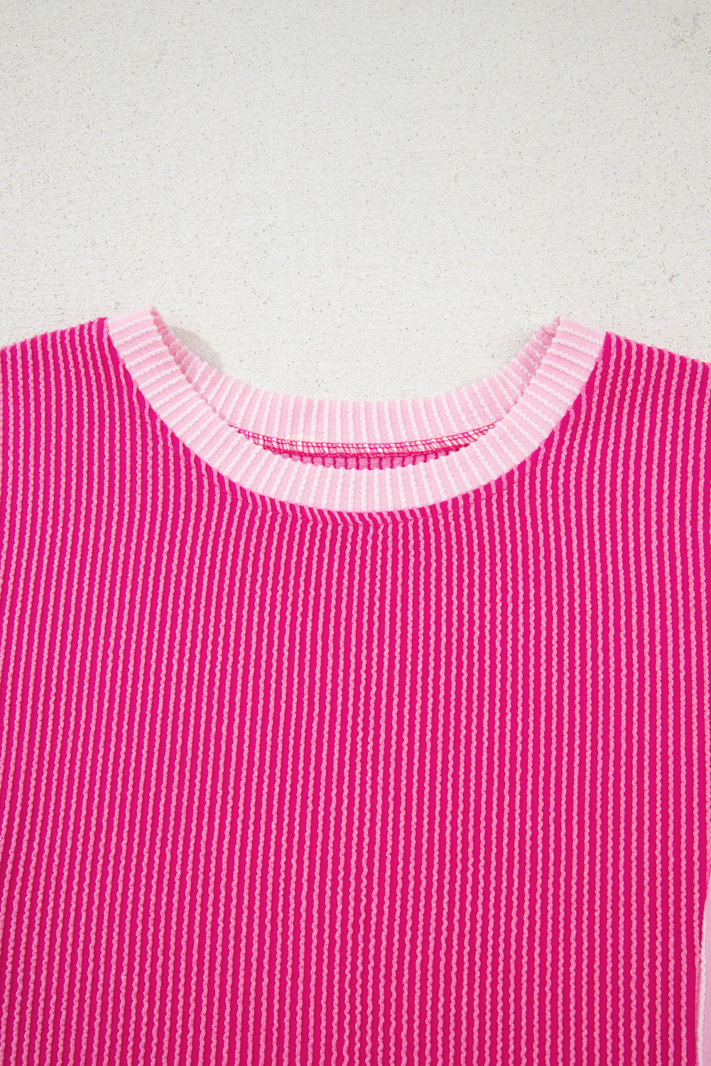 Rose Red 3D Spiral Ribbed Texture 2 Tones Patchwork Short Set